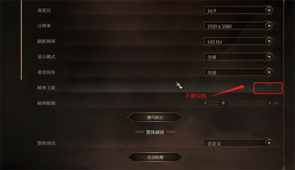 帧率限制会让我们的游戏fps锁在一个固定范围中,我们需要把这个设置取消勾选。