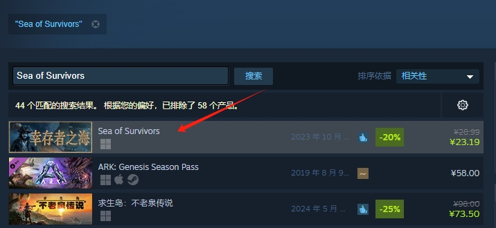 这款游戏在Steam上的名称是《Sea of Survivors》,玩家只有输入这个英文名称才可以搜到。