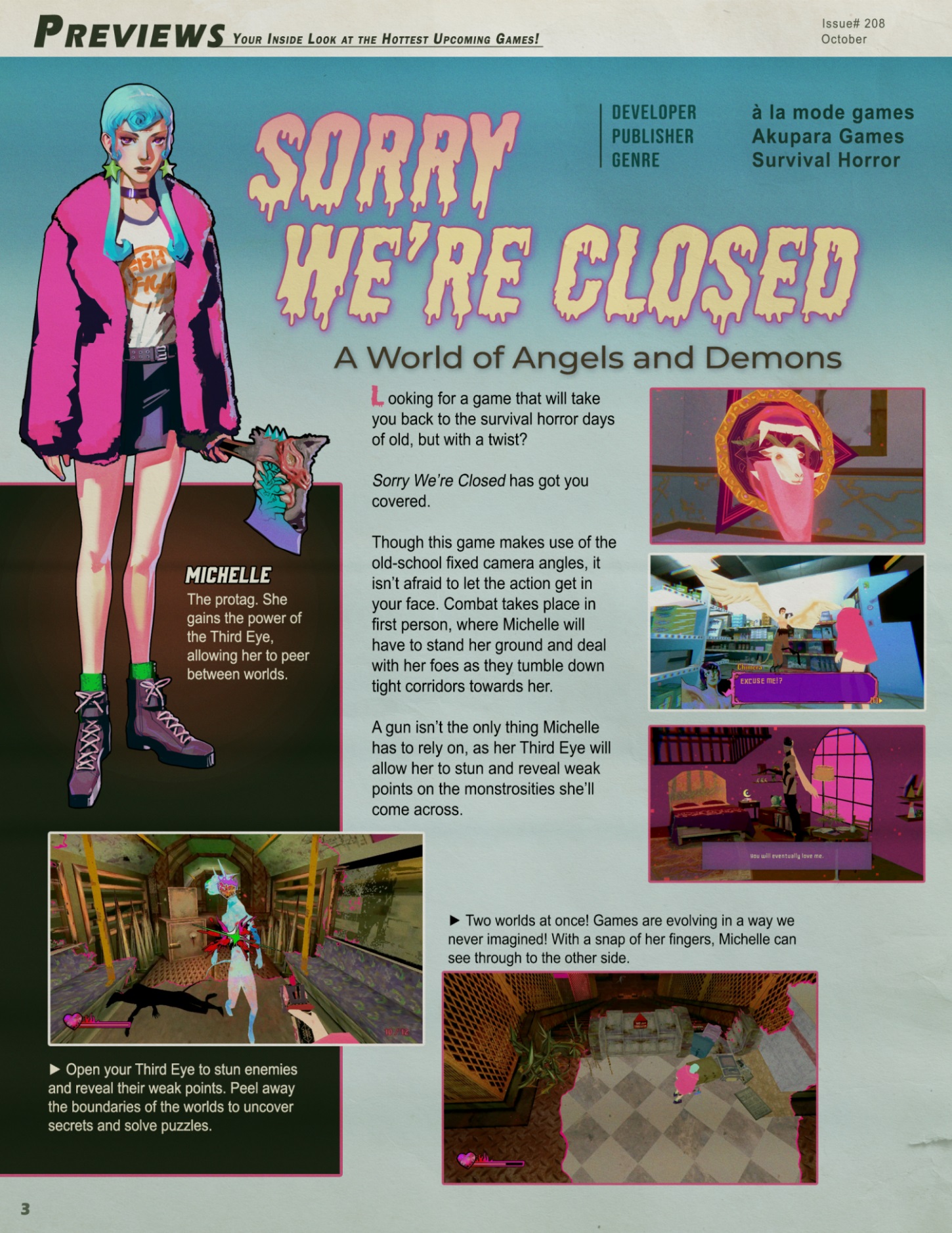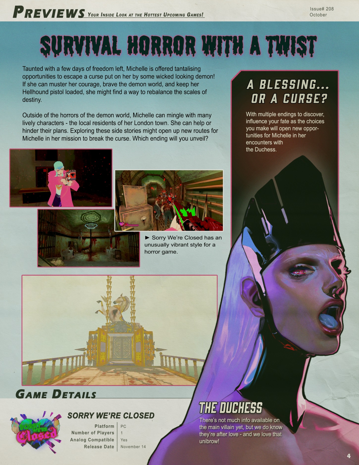 对不起我们关门了(Sorry Were Closed),怀旧风格的单人生存恐怖游戏,玩家将进入一个充满奇幻与恐怖的恶魔世界。游戏采用经典的固定视角,提供一种独特的氛围体验。故事围绕主角米歇尔展开,她被强大的恶魔施加了诅咒,需要在有限的时间内冲破困境,追寻自由。
